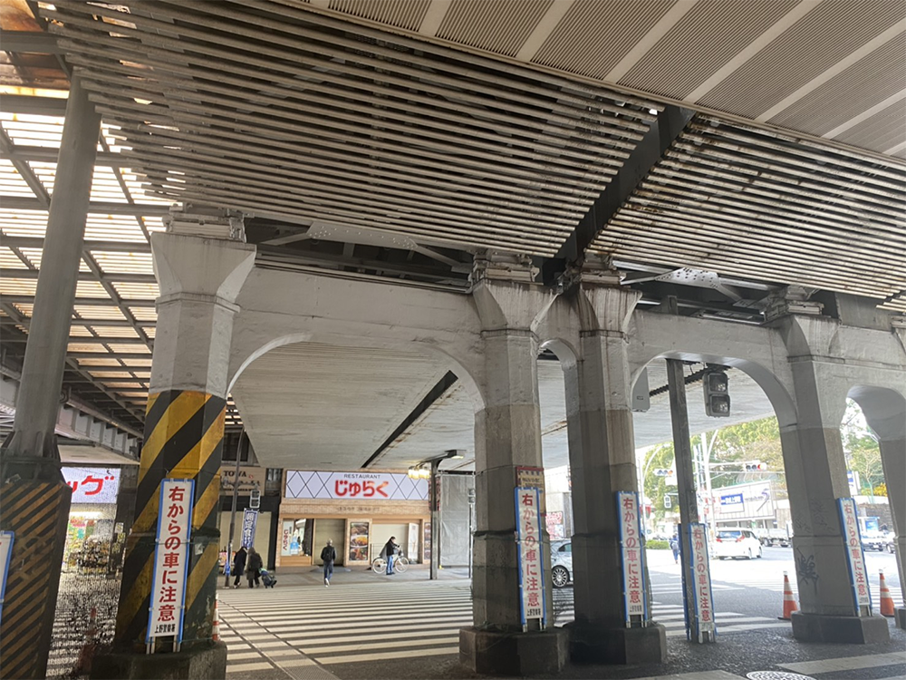 2)高架下の信号を渡り、右へ進んでください。
